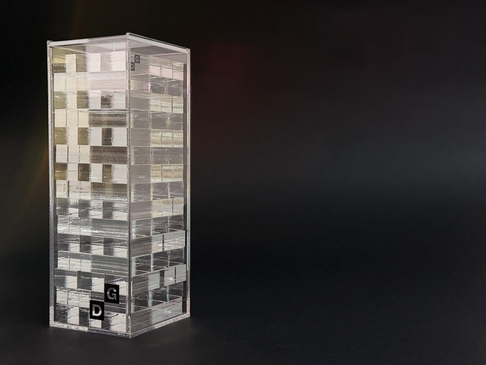 Дженга из прозрачного акрила - символ строительства и проектного баланса. Как и в реальной стройке, здесь важны точность, интуиция и доверие. Устойчивость рождается из внимания к деталям, а рост - из слаженной работы команды. Прозрачный «ледяной» акрил подчеркивает чистоту решений и ясность процессов.